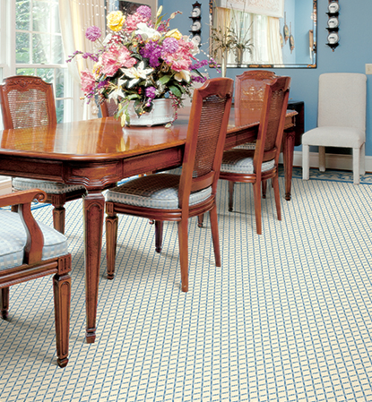 While other rooms in your home may have multiple purposes, your dining room should be considered as the entertaining mecca of your home. Many consider the dining room as your space in the home that should showcase your signature style. A dining room will have heavy furniture pieces, you will also have to deal with the movement of chairs, as well as accidents from food and drink spills. Wool carpets and synthetic fibers such as nylon are easy to maintain and clean. Multi-colored and patterned carpets have the advantage of disguising spills; an all-over pattern that is not hidden by the dining room table would be a good choice. Patterns that repeat in particular stripes or geometrics can be used to make the room look wider or longer. Loop pile, cut and loop and multi-level loop piles will give you a luxurious appearance.