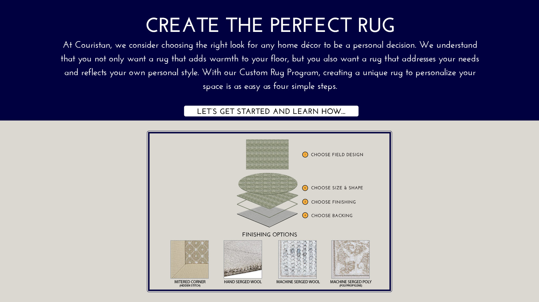 This Product can be fabricated into a Custom Size Rug. Available Finishing Options include, Wool Machine Serging, Wool Hand Serging, Synthetic Serging, Chenille Bindings, Cotton Fabric Bindings, Linen Bindings, Courtronâ„¢ Polypropylene Bindings and Synthetic Binding.