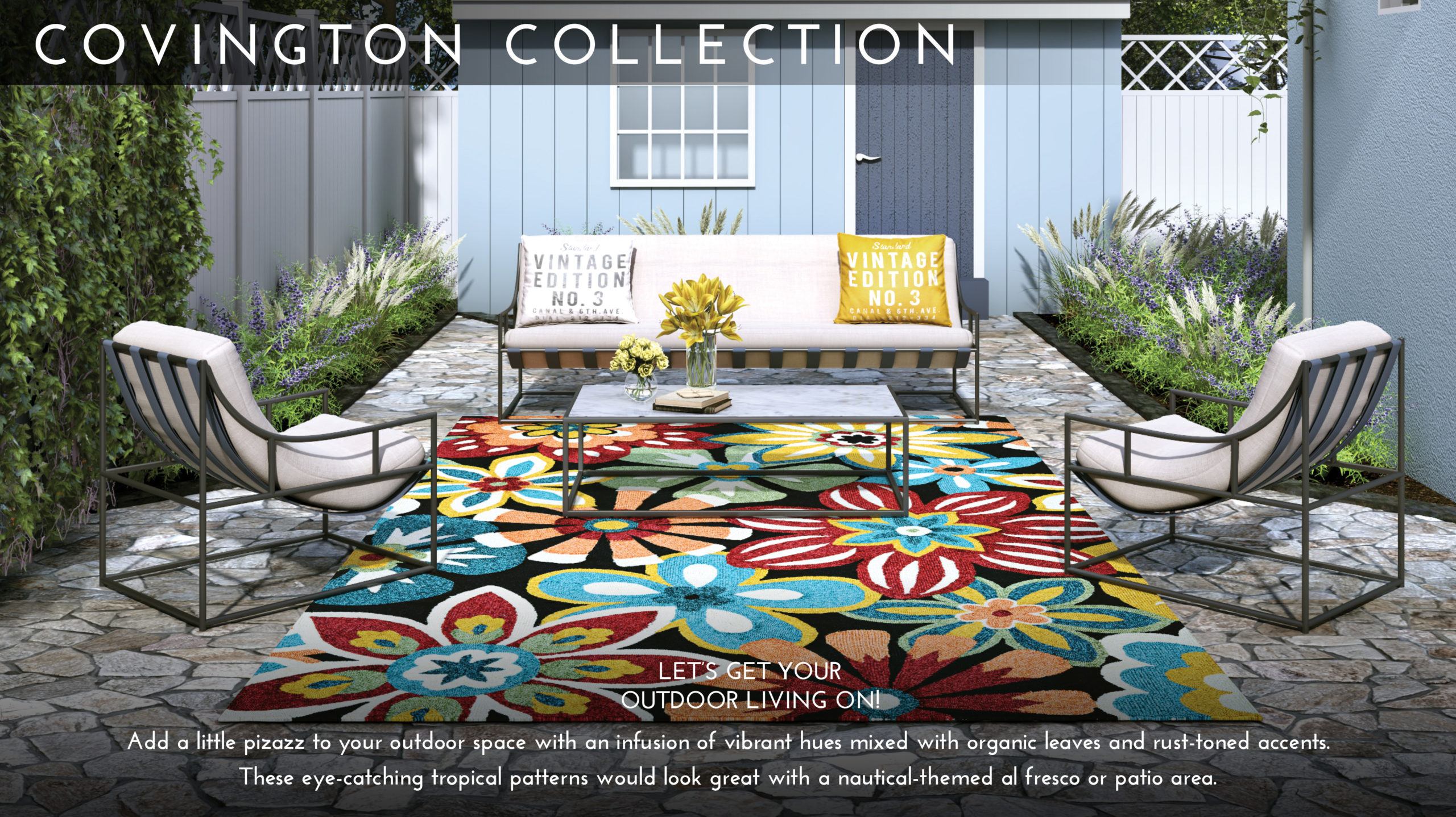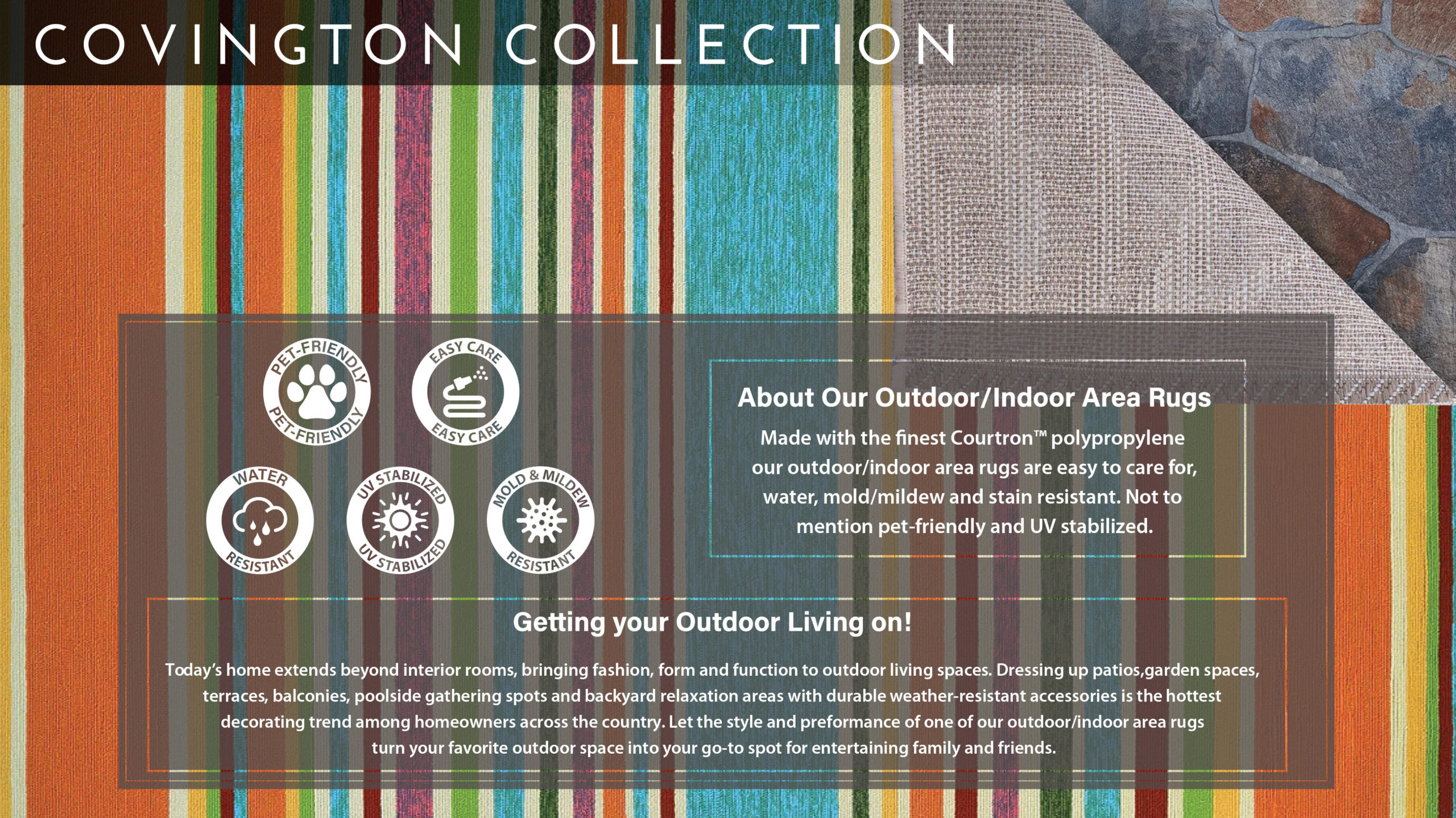 Complementing trends in both outdoor furniture and interior fashions, the Covington Collection is a go-to resource for home decorators with lots of spaces to cover. Add warmth and worry-free fashion to virtually any area of the house with these ‘next generation’ performance quality area rugs, where style meets strength and design meets durability.