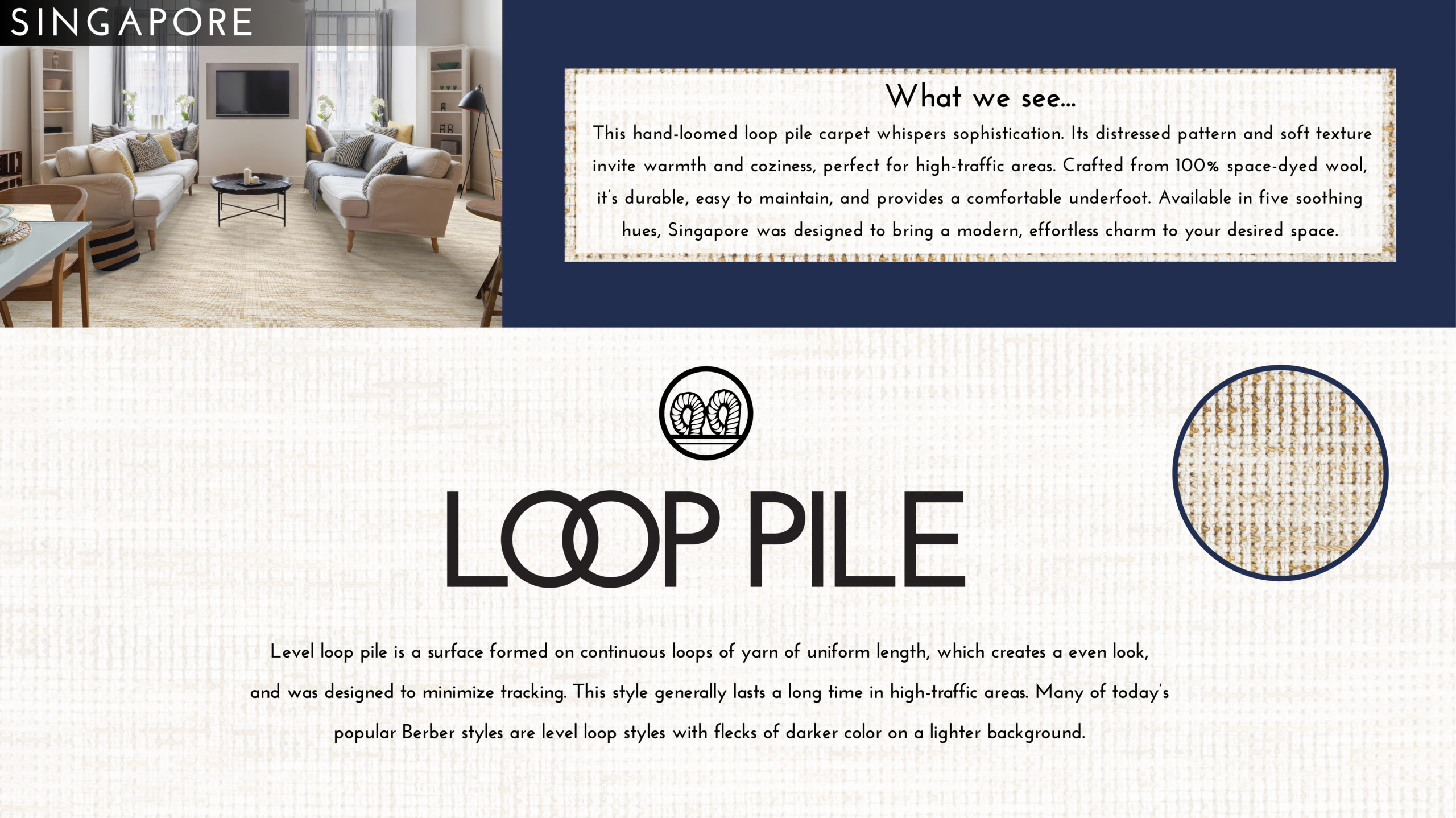Singapore is a luxurious, hand-loomed loop pile carpet with a carefully textured design that's meant to revitalize the look of your home with a refreshed and sophisticated foundation. Its multicolored tonal distressed pattern will fill a space with unique dimension and texture, making it perfect for high-traffic areas while hiding spots and dirt that may come from outside. This nature-inspired carpet not only looks stunning but also feels incredibly soft to the touch and provides a comfortable underfoot. Meticulously crafted from 100% space-dyed wool, Singapore's pile is extremely durable and easy to maintain. Available in five soothing colorways - Denim, Quartz, Sand, Seaglass, and Teal - that complement a range of design styles from transitional to contemporary,  this luxurious carpet is generously stocked 15' wide, providing total decorating flexibility. Exuding a cozy yet minimalist feel Singapore will provide the perfect design element for giving your home a modern update when paired with furnishings that have pops of color.