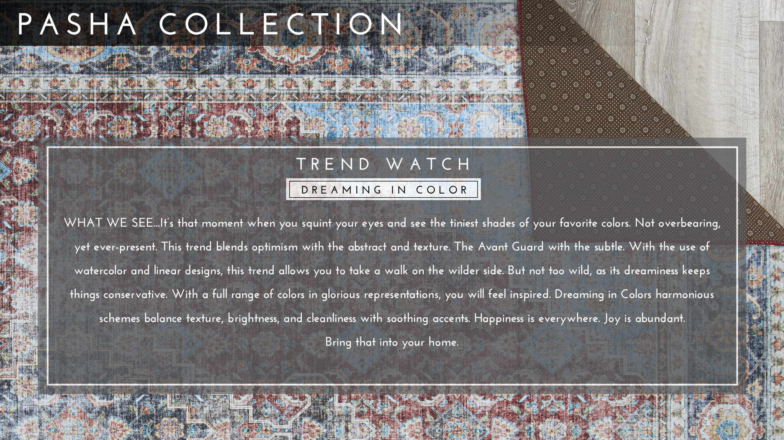 A unique fusion of classic and contemporary, Pasha offers a series of jewel-toned area rugs that are designed to brighten the appearance of any transitional setting in the home. With its fresh, modern color palette and an array of modern-traditional patterns, these treasured floor coverings are perfectly suited for spaces that blend sophisticated tradition with personal style.  Featuring a machine-woven base of 100% polyester that provides a soft underfoot and a chic appeal, the craftsmanship and materials applied to these digitally printed area rugs is superior to any other area rug of its kind in today’s market. The addition of a non-skid backing and saddle-stitched edges add to the overall value of this unique collection. Either used as an accent piece or as the primary inspiration for a complete decorating scheme, these old-world designs in modern interpretation are sure to become a point of interest in any interior.