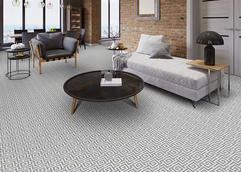 Offering a sophisticated, transitional appeal with its striking palette of refreshing colors and geometric design, Emerald Isle has been created to set a strong foundation for any interior in the home. Offering a virtual labyrinth at your feet, this carefully balanced, casual Greek Key design will upgrade any room in your home. The grand scale effect is paired with a fresh, serene, color palette in five hues, including Aqua, Blue, Green, Silver and Slate. Emerald Isle is a charming choice for all décor styles from casual to traditional. This hand-loomed loop pile carpet is woven of 60% wool and 40% ECONYL® nylon. In addition to being soft, these high-quality fibers offer an immense array of practical benefits, such as long-lasting durability, resiliency and color retention. Stocked 15' wide to minimize seams and ensure an upscale installation, Emerald Isle awakens the senses with its stunning style and passionate range of colors.