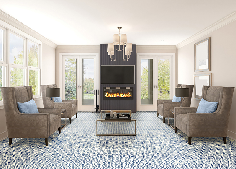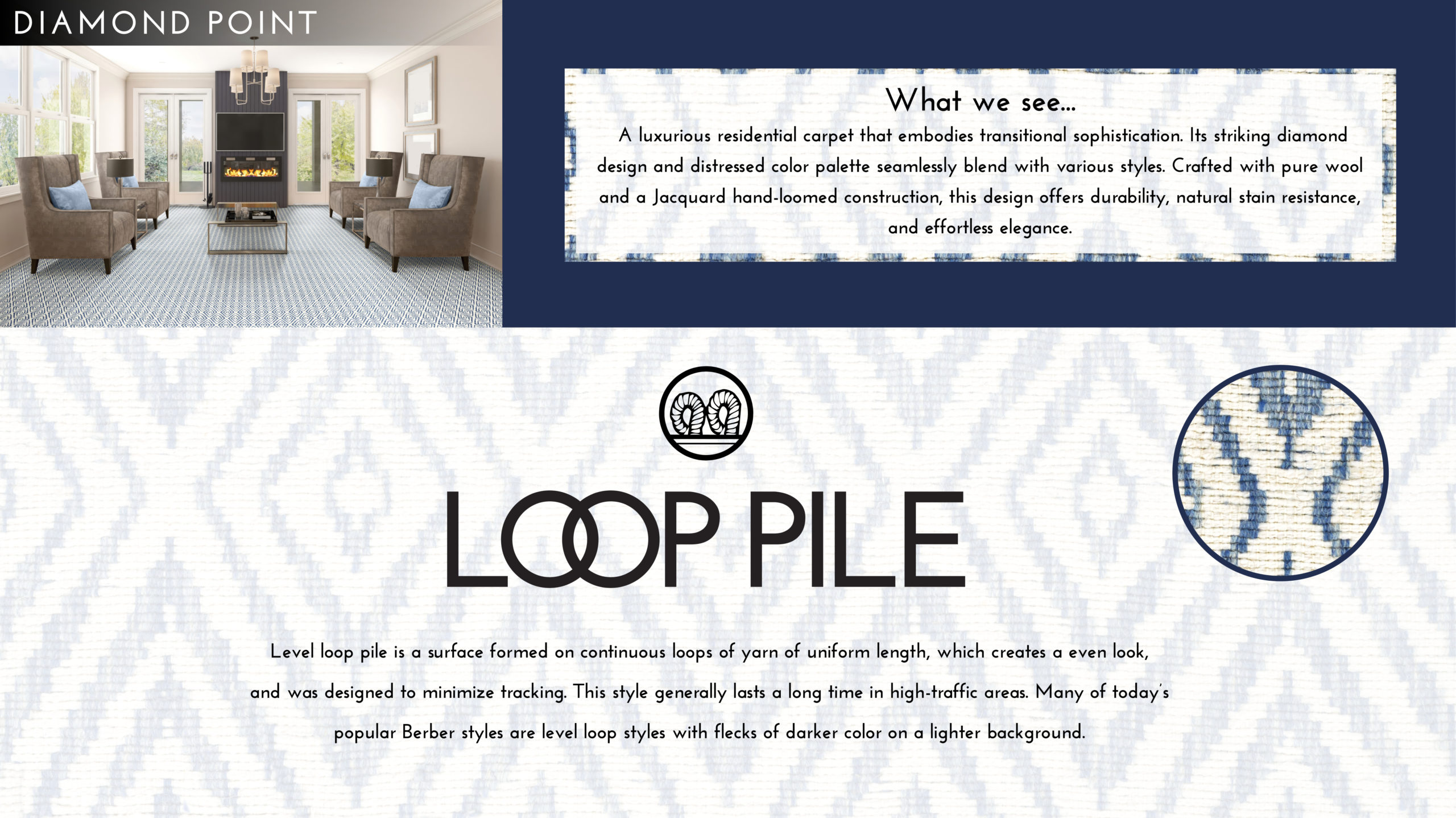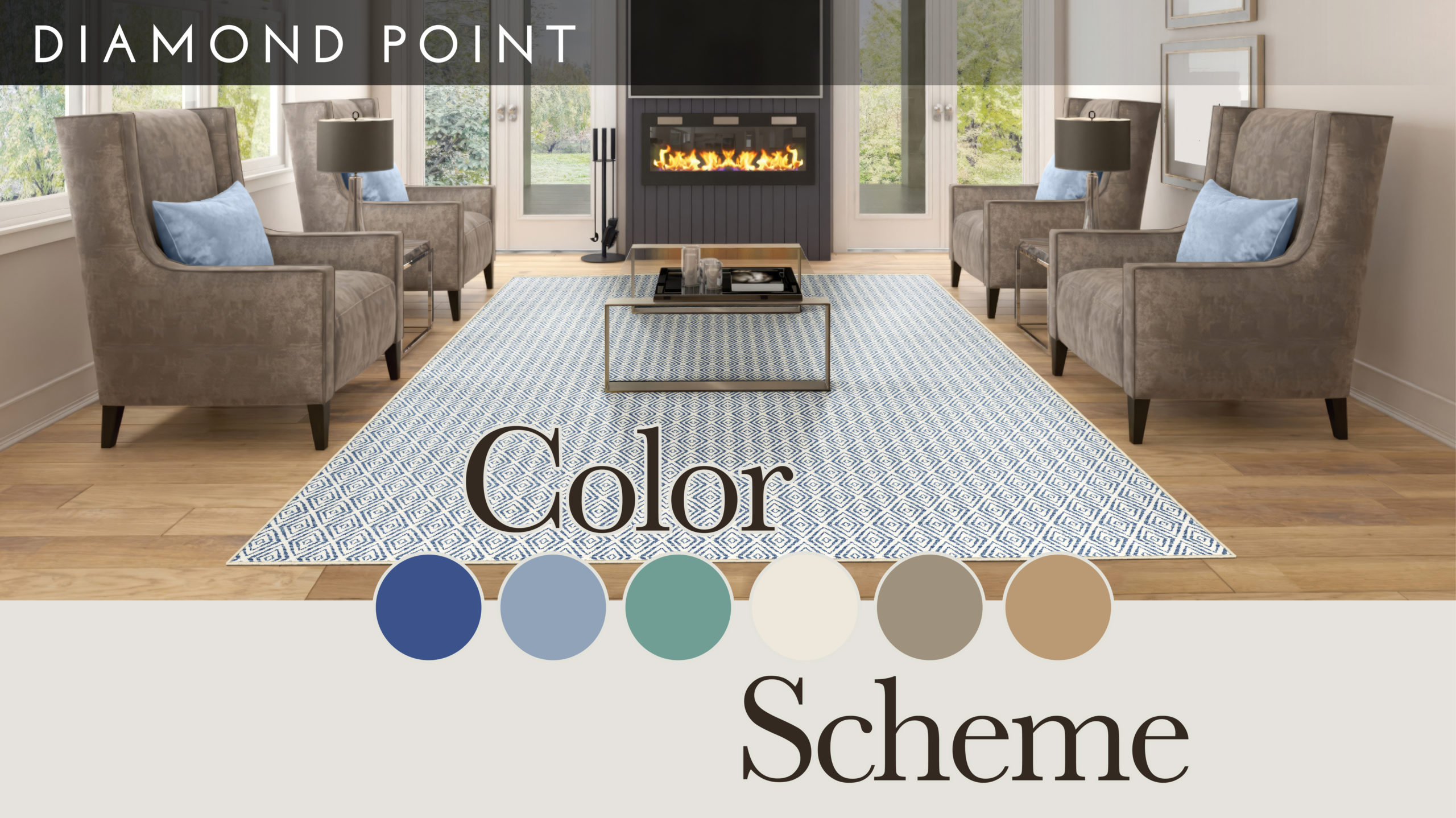 Elevate your space with Diamond Point, a sophisticated residential carpet that brings transitional style to your home. Its primitive diamond design beautifully transforms any room, and its distressed color palette of Beige, Blue, Denim, Green, and Oatmeal pairs seamlessly with various decorating styles. Crafted with a luxurious Jacquard hand-loomed construction, Diamond Point features a 100% pure wool loop pile that's soft, durable, and easy to maintain. This high-quality carpet boasts natural flame resistance and retains its luxurious appearance despite heavy foot traffic. Generously stocked 15’ wide to ensure an upscale installation with minimal seams and for custom rug fabrication, Diamond Point's timeless appeal allows you to effortlessly incorporate textures, colors, and patterns, completing your space with elegance and a sharp transitional appeal.