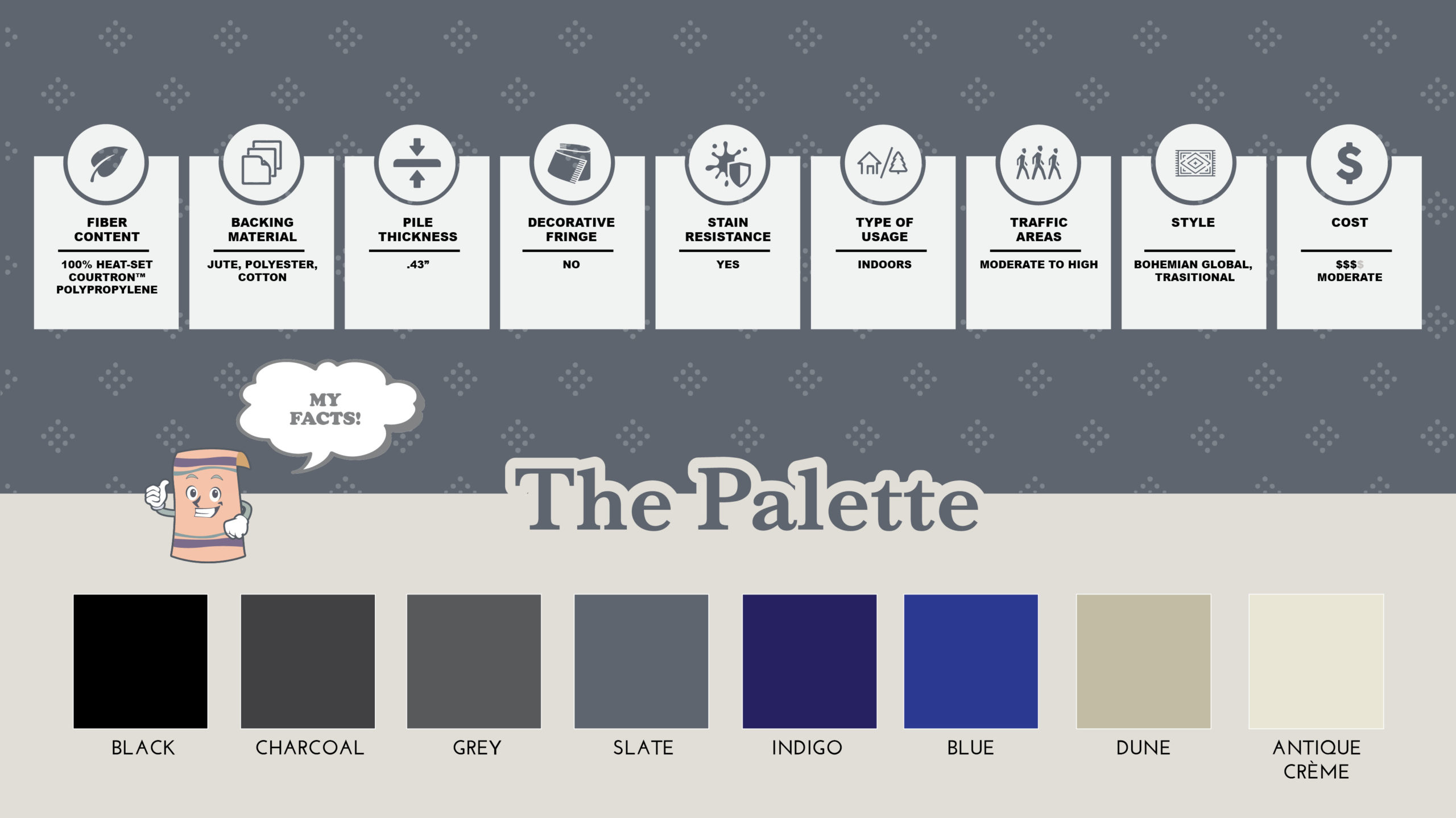 Black, Custard, Delft, Grey, Slate