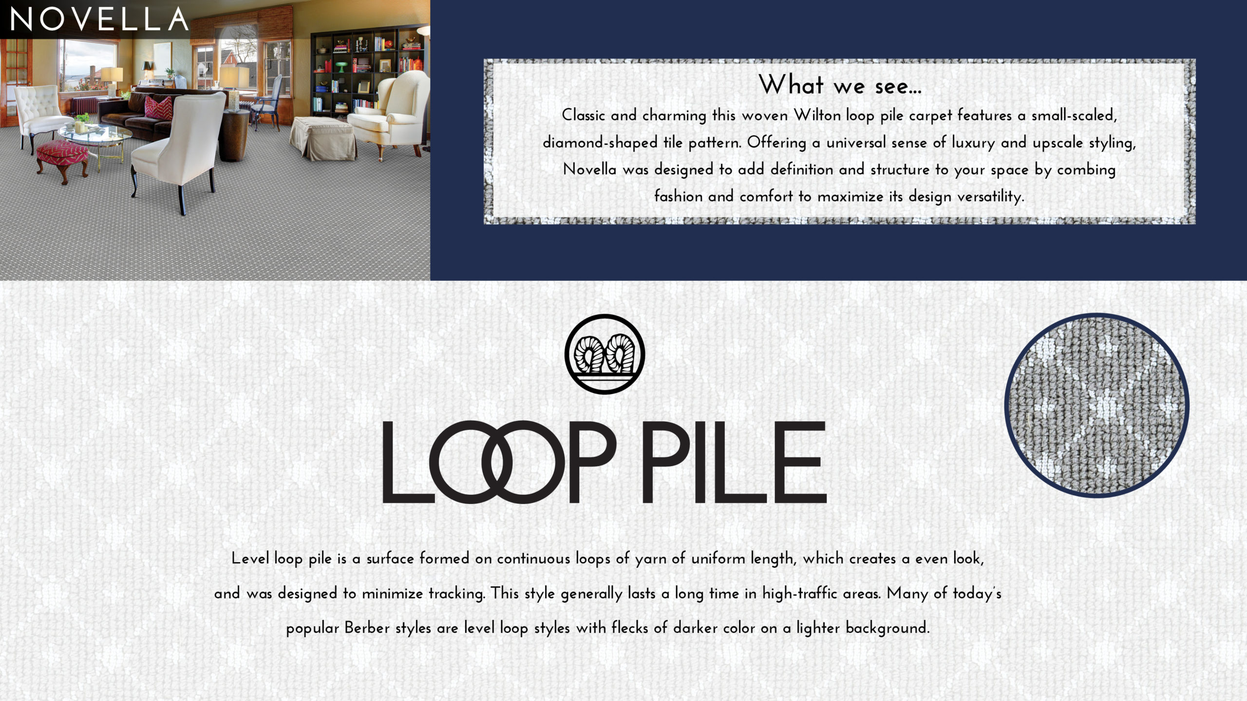 Classic and charming, Couristan presents the exquisite elegance of Novella. Showcasing a small-scaled, diamond-shaped tile pattern, this look works well with a wide array of décor tastes while offering a universal sense of luxury and upscale styling. A unique pile blend of 73% New Zealand wool and 27% provides a soft and velvety pile, that resist wearing and permanent stains making Novella ideal for frequently used spaces. Woven on Wilton looms, this quality loop pile carpet is produced with the utmost precision and quality. Novella is stocked 13'2" wide for decorating flexibility, resulting in a magnificent installation that will stand the test of time. Combining fashion with true comfort and a highly durable construction, this timeless carpet is certainly no diamond in the rough.