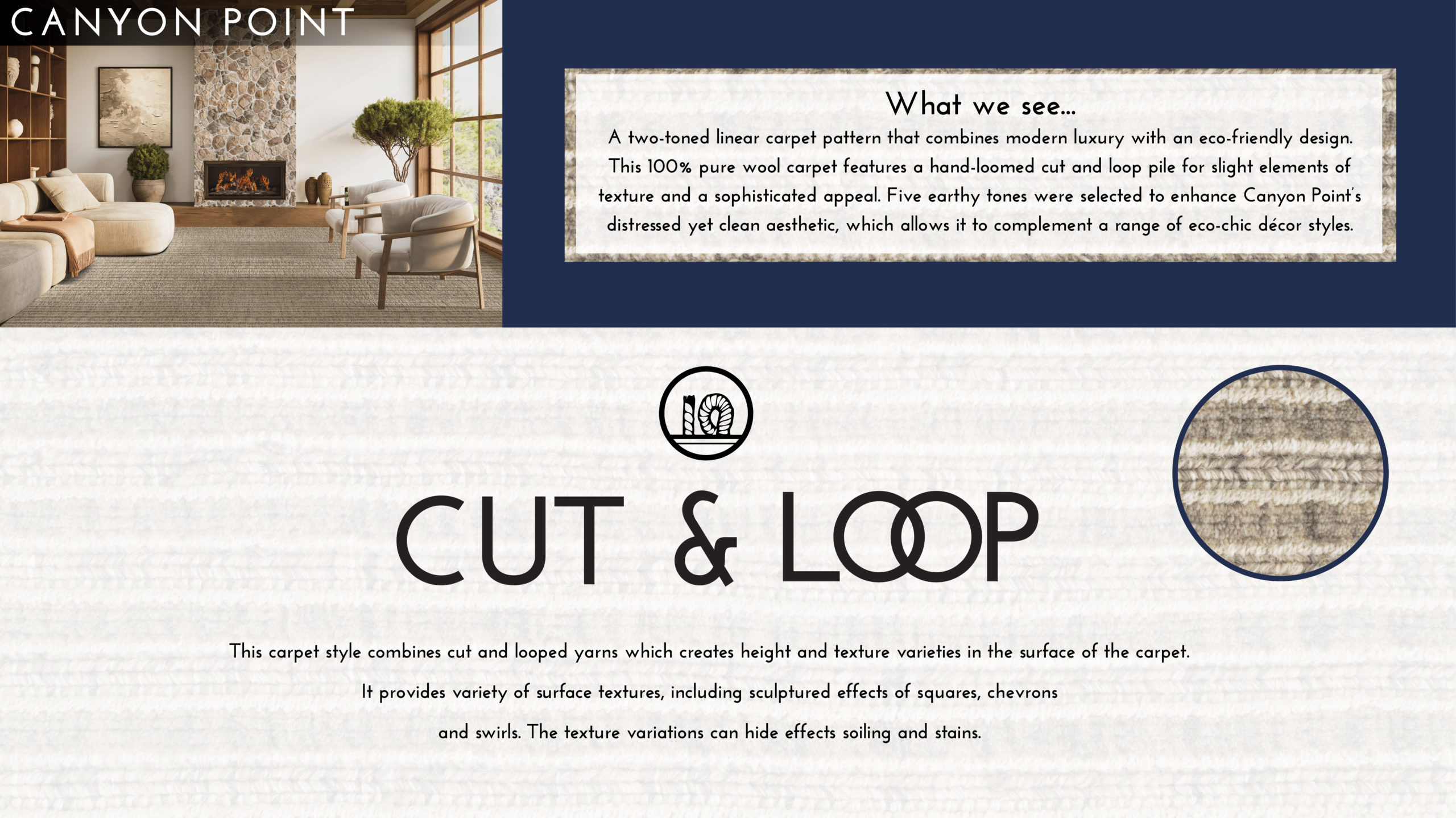 Elevate your space with Canyon Point, a masterfully crafted carpet that combines sleek sophistication with eco-friendly charm. Its two-toned linear pattern and plush cut and loop pile creates a streamlined backdrop for refined décor, exuding modern luxury. The luxurious hand-loomed surface boasts careful texturing, lending a sophisticated sheen to any room. Made from 100% pure wool, Canyon Point embodies environmentally conscious design without compromising on durability. Choose from five earthy tones - Multi Beige, Multi Cream, Multi Grey, Multi Taupe, and Multi Silver - each with a distressed yet polished aesthetic that complements a range of styles. Available in a convenient 15' width and customizable to your desired size, Canyon Point brings high-end style and sustainability to your floor.