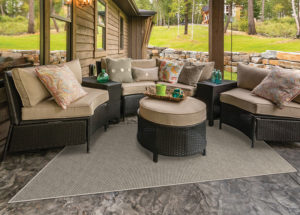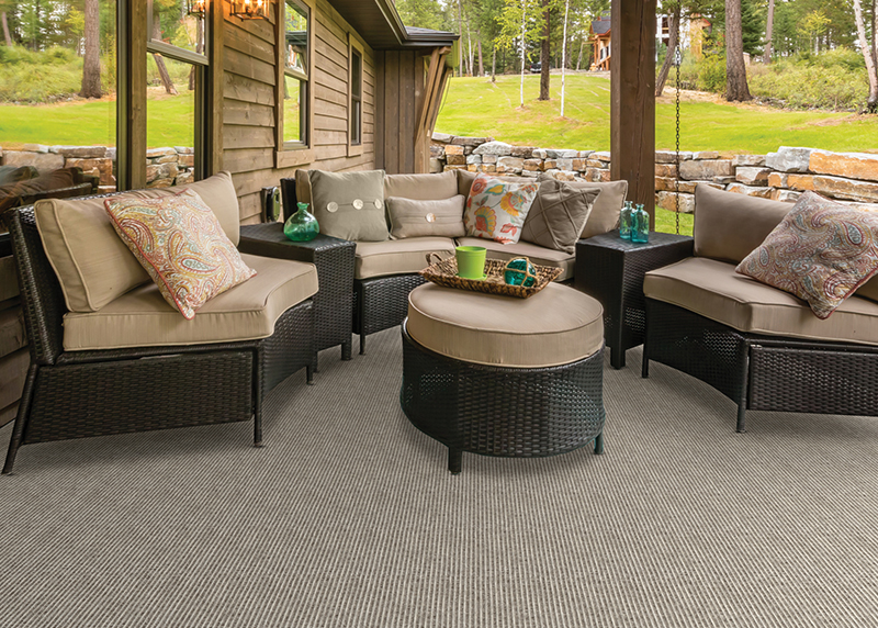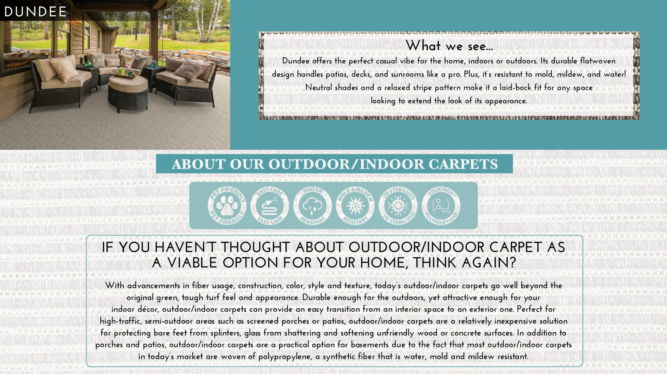 Displaying a soothing, natural elegance tailored for today’s casual yet high-performance indoor and outdoor living spaces, Dundee offers a unique visual appeal unmatched by any other floor covering in its category. Crafted with a durable structured flatwoven construction, it is ideally suited for patios, decks, sunrooms, bedrooms, and sitting rooms. Dundee’s 100% UV-stabilized Courtron™ polypropylene pile is mold, mildew, and water resistant, ensuring long-lasting performance in a variety of environments. The design's relaxed, inviting aesthetic is enriched by three neutral shades—Ocean, Pewter, and Sand—each selected to add depth and dimension to its casual stripe pattern. Available in a 13'2" width, Dundee provides a strong, natural foundation for any casual living space, indoors or out.