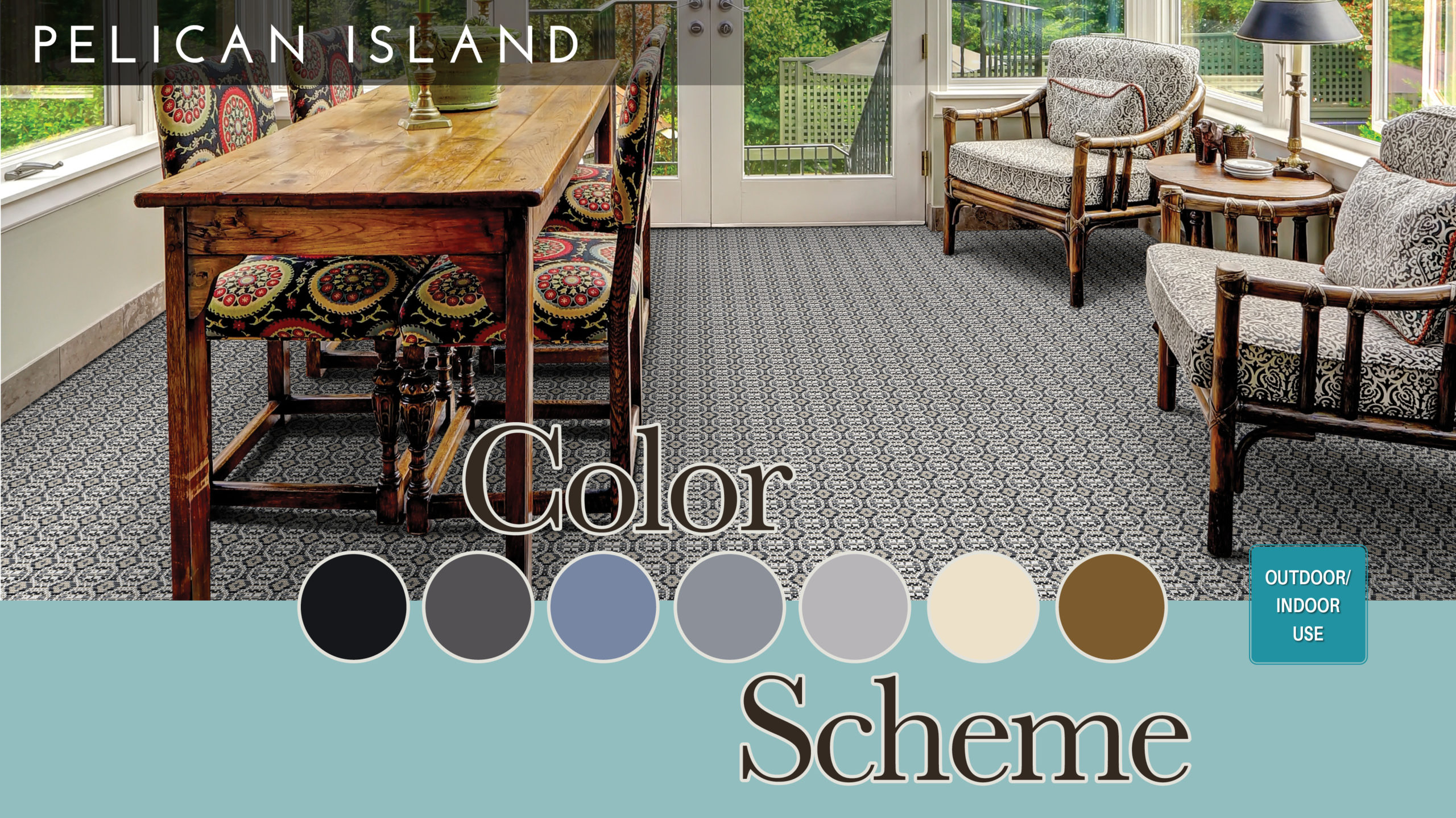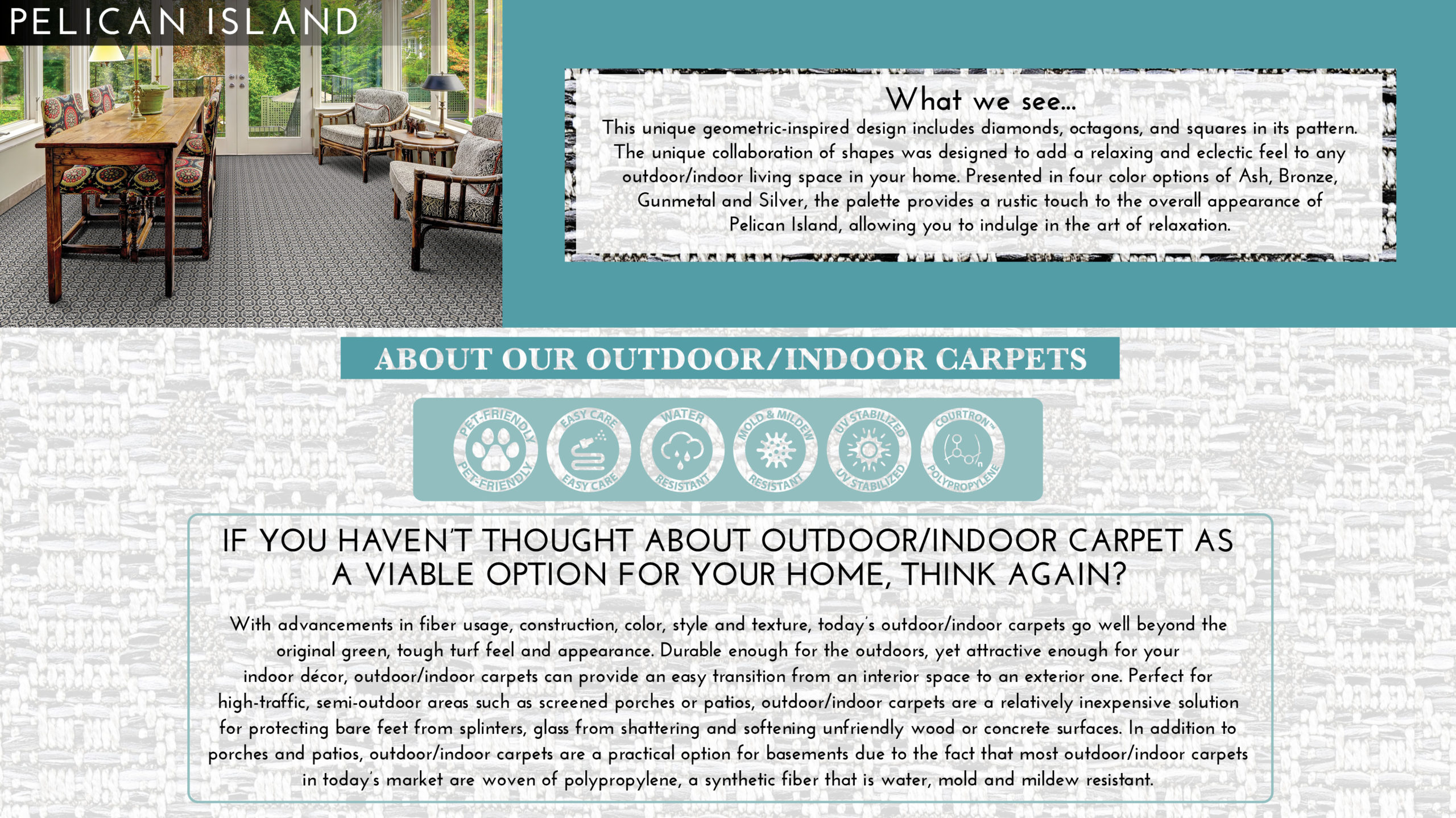 Indulge in the art of relaxation with Pelican Island by Couristan. This premium-quality carpeting offers a fashion statement for the floor with its beautiful island elegance that is available in a 13'2" width. Presented in four, fresh color options, including Ash, Bronze, Gunmetal, and Silver, Pelican Island is woven of 100% Courtronâ„¢ polypropylene for added comfort and durability and features a blend of colors and added design interests. The unique geometric-inspired pattern, including diamonds, octagons, and squares, adds a relaxing, eclectic feel to any indoor/outdoor living space in your home. Perfect for your sunroom, covered patio, detached pool house, Pelican Island is mold/mildew resistant and UV stabilized.