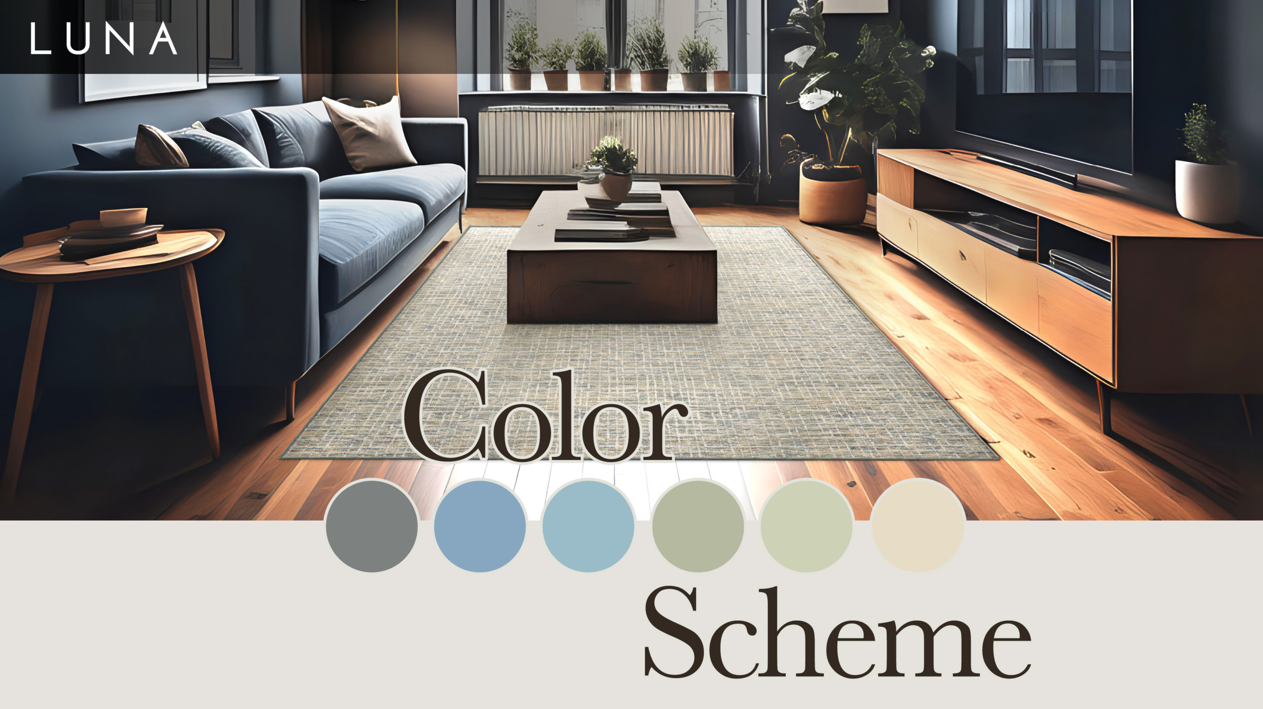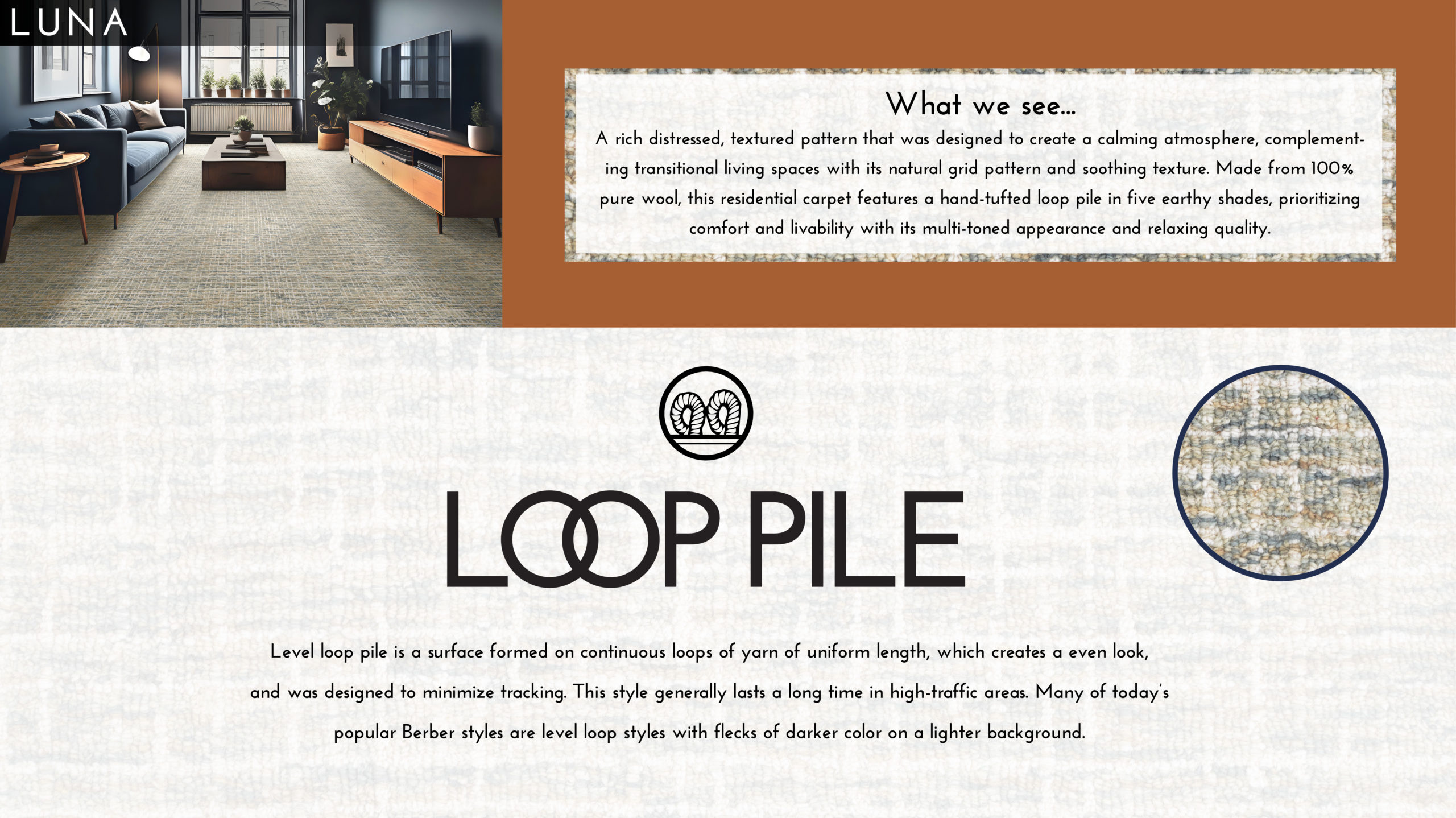 Luna embodies chicness with its rich distressed, textured design, crafting a calming atmosphere that seamlessly complements various transitional living spaces. The handsome grid pattern features a natural, linear aesthetic with small-scaled squares, adding a soothing texture to the floor without overpowering the space. This residential carpet boasts a hand-tufted loop pile, available in a versatile 15' width for custom fabrication and decorating flexibility. Made from 100% pure wool, Luna offers natural comfort and durability while adding dimension and visual interest to any room. The design includes five earthy shades - Azure, Greige, Multi, Sage, and Sky - each with accent colors creating a multi-toned appearance that brings a cool, relaxing quality to demanding living spaces, prioritizing comfort and livability.