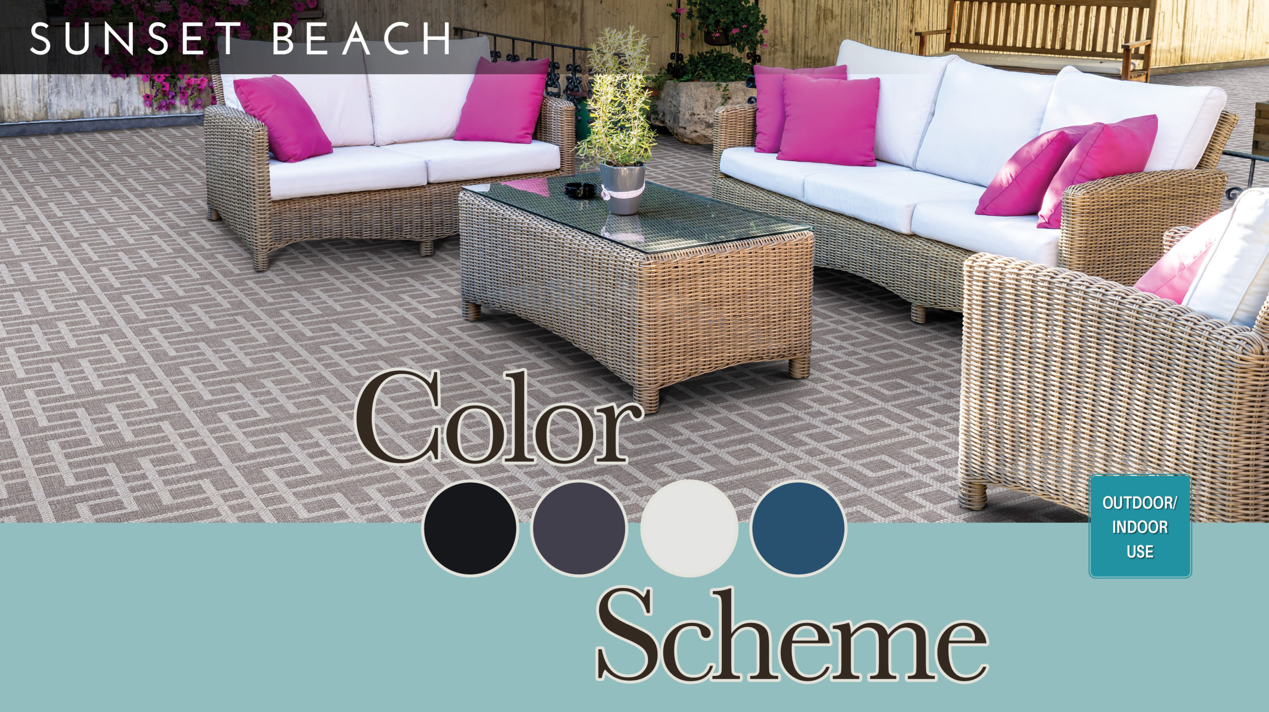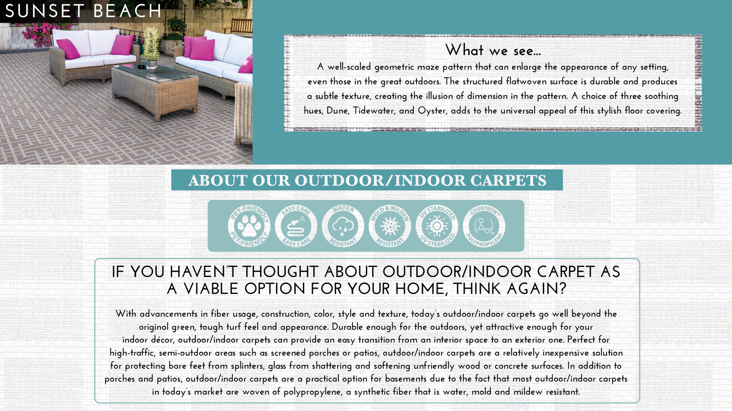 Offering a durable luxury for any home oasis, Creations by Couristan™ presents Sunset Beach. Designed to add comfort and a sophisticated polish to today's popular open-air living spaces, this beautifully crafted residential carpet is versatile enough to be used in favored interior rooms as well. Ideal for those who like to live, dine and entertain beyond the interior walls of a home, Sunset Beach offers a well-scaled geometric maze pattern that can enlarge the appearance of any setting, even those in the great outdoors. Stocked in a width of 16'1”, Sunset Beach features a sturdy 100% Courtron™ polypropylene flatwoven construction which makes it both mold and mildew resistant, a key quality in any flooring product exposed to outdoor elements. Resistant to permanent stains and easy to clean, it is also a practical choice for areas where food is served or where active children play. Highlighted in a contrasting appearance Sunset Beach’s structured flatweave produces a subtle texture in its surface and creates the illusion of dimension in the pattern. Available in a choice of three soothing hues, Dune, Tidewater and Oyster, decorators will love the way this product coordinates with most outdoor accessories and furniture.