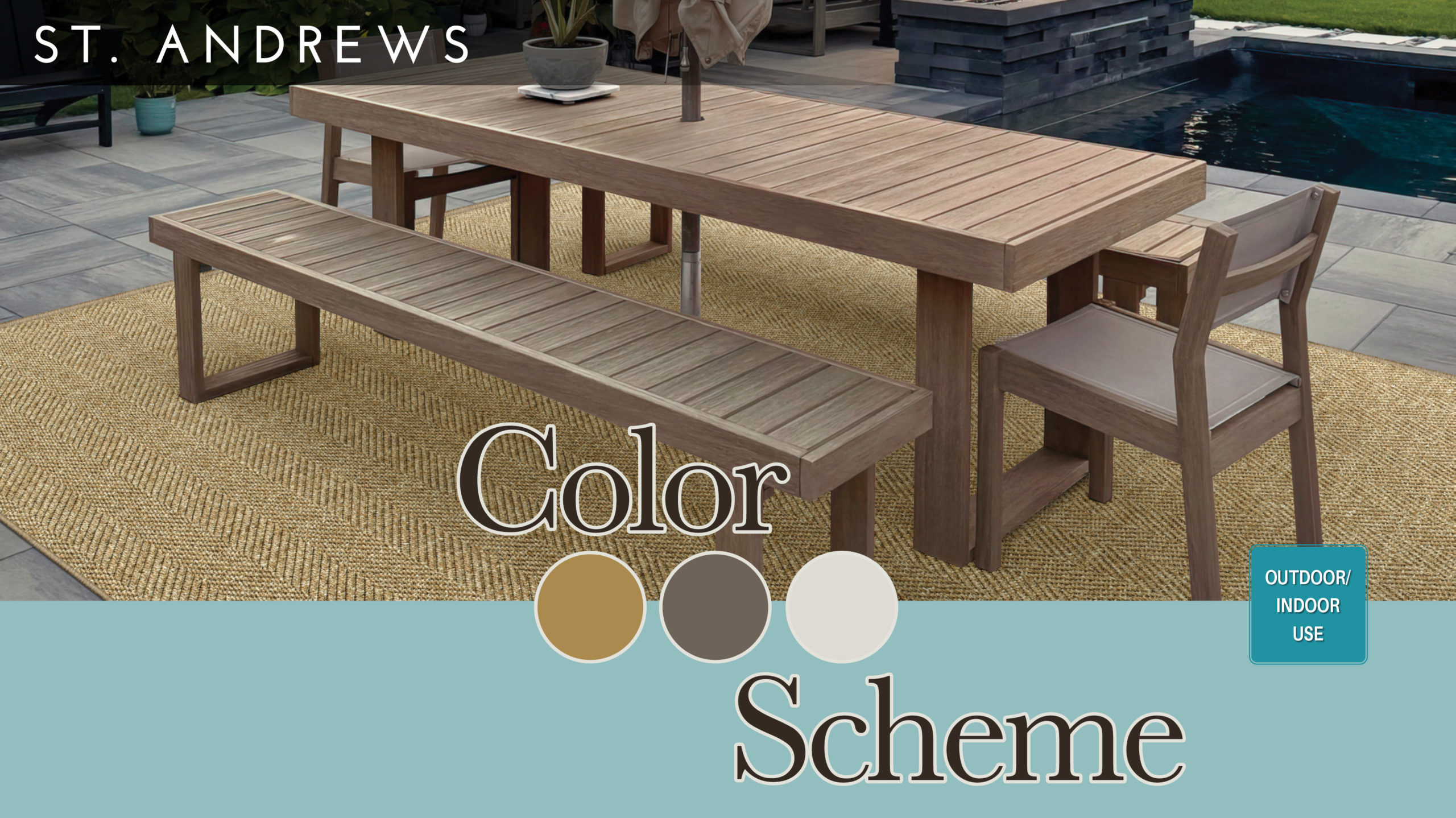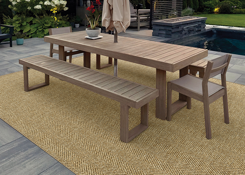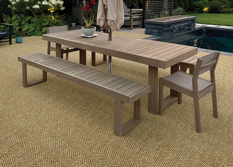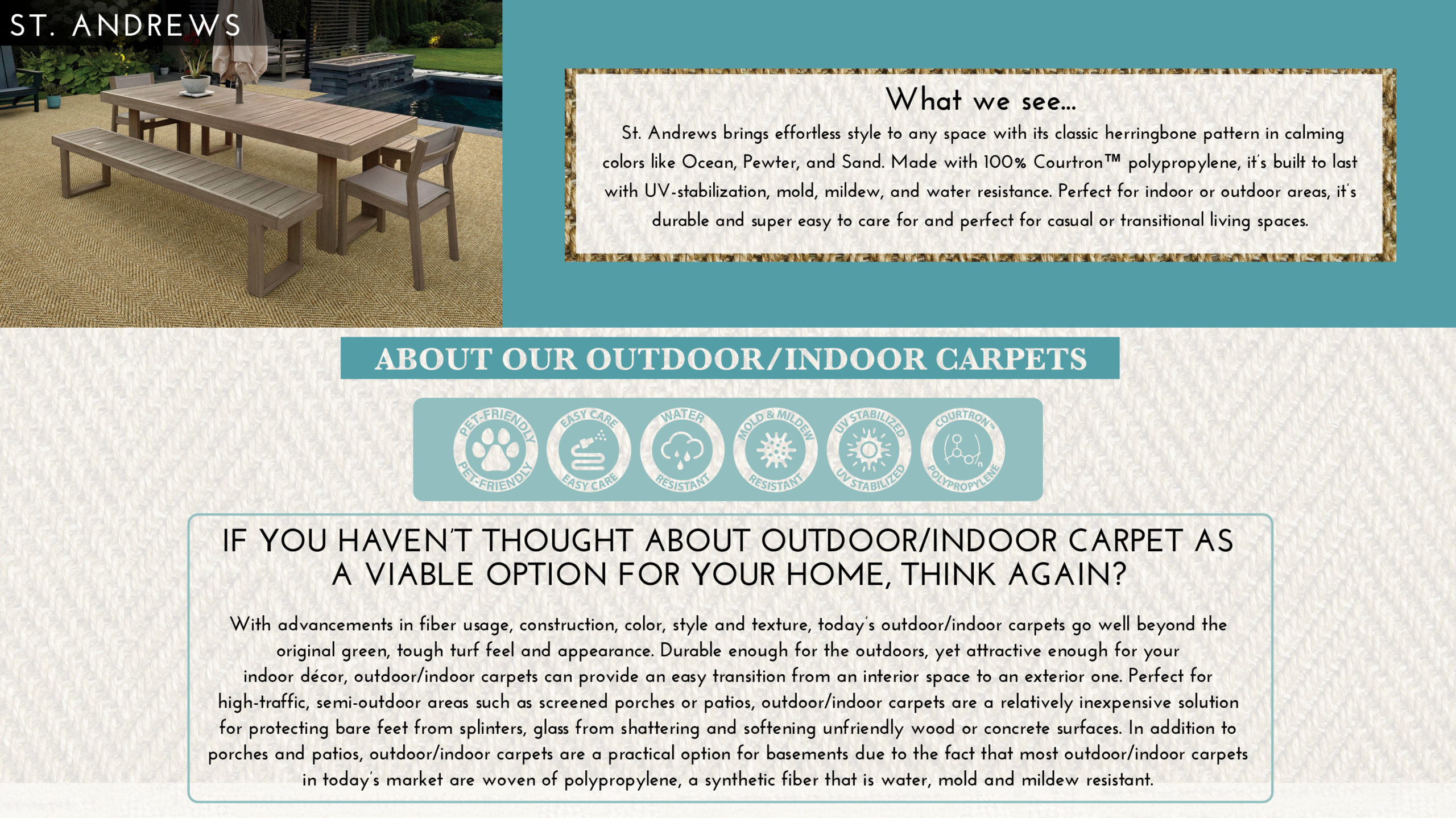 Offering a carefully manicured herringbone pattern highlighted by warm, inviting base colors, St. Andrews delivers versatility and effortless style to any casual or transitional living space—indoors or out. This 13'2" wide residential carpet is available in three fresh, soothing hues—Ocean, Pewter, and Sand—each selected to provide a flexible foundation for a variety of design aesthetics. Flatwoven of 100% Courtron™ polypropylene for lasting beauty and durability, St. Andrews features a finely scaled herringbone pattern ideal for custom rug fabrication or for visually expanding the size of a room. UV-stabilized to resist color fading from harsh weather and prolonged sun exposure, this performance-driven construction is also mold, mildew, and water resistant, making care virtually effortless.