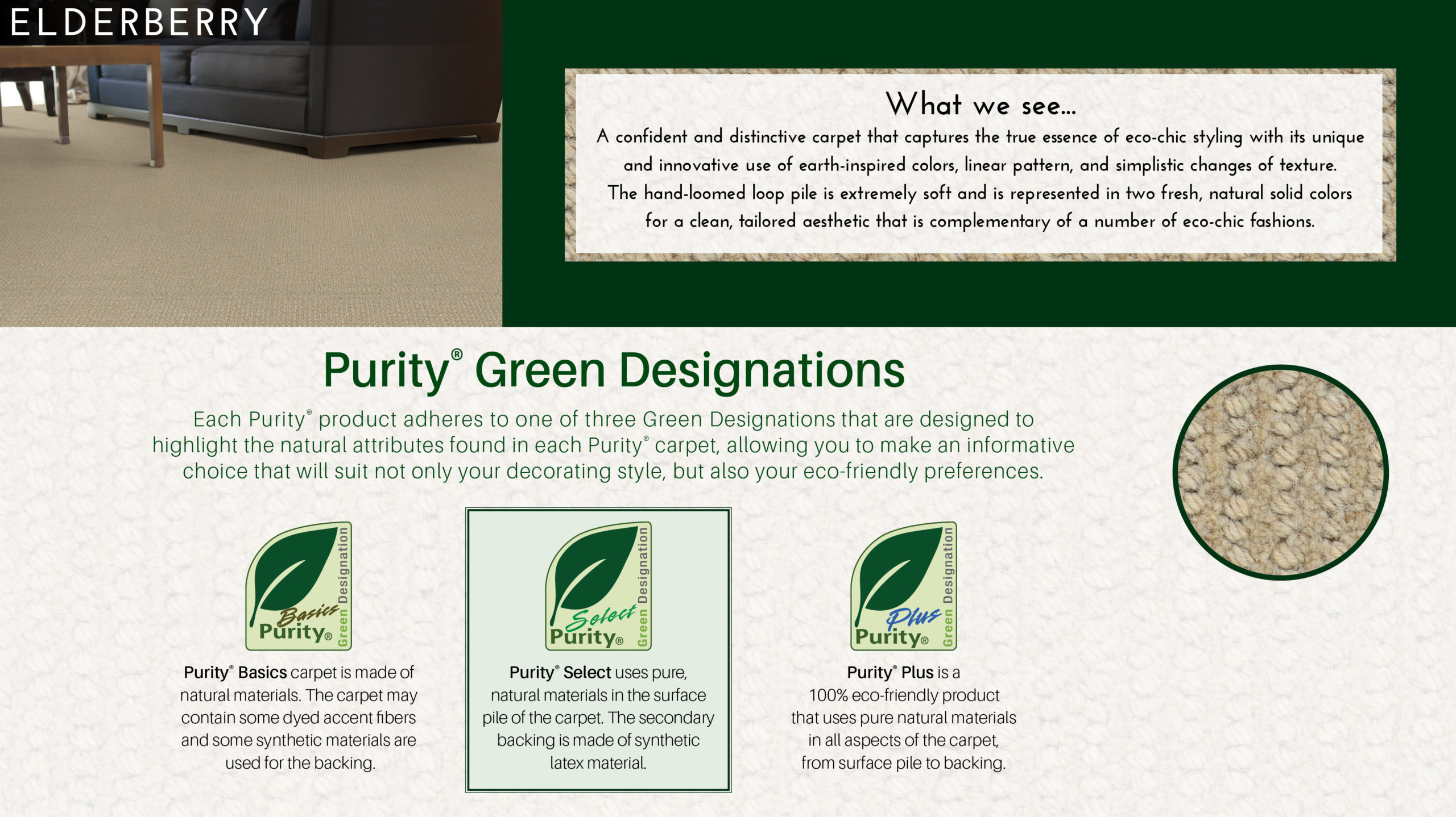 Purity Select carpets are made with sustainable materials, featuring a 100% pure wool surface and natural primary and secondary backings.