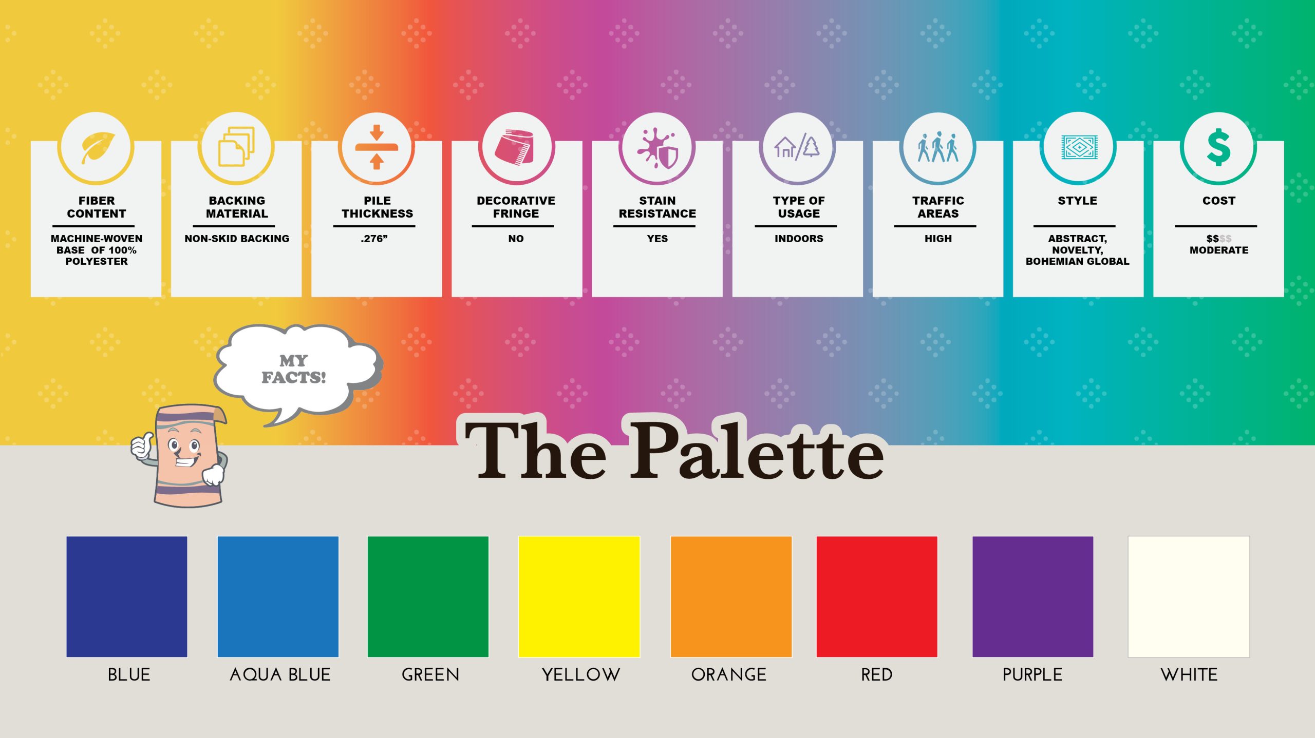 For those who take a more eclectic approach to decorating, the Rainbow Collection offers a refreshing series of fun-filled novelty area rugs, vibrantly designed in aggressive hues of Blue, Red, Orange, Yellow, Green and Purple. These fashion-forward area rugs are a perfect choice for game rooms, kids rooms and rooms that are purely based on color. Featuring a machine-woven base of 100% polyester that provides a soft underfoot and chic appeal, the craftsmanship and materials applied to these digitally printed area rugs is superior to any other area rug of its kind in today's market. The addition of a non-skid backing and serged edges add to the overall value of this unique collection. Perfect for contemporary or transitional settings, these vibrant, whimsical area rugs will add a comfortable and sophisticated appeal to any interior that was designed for its fun-filled atmosphere.
